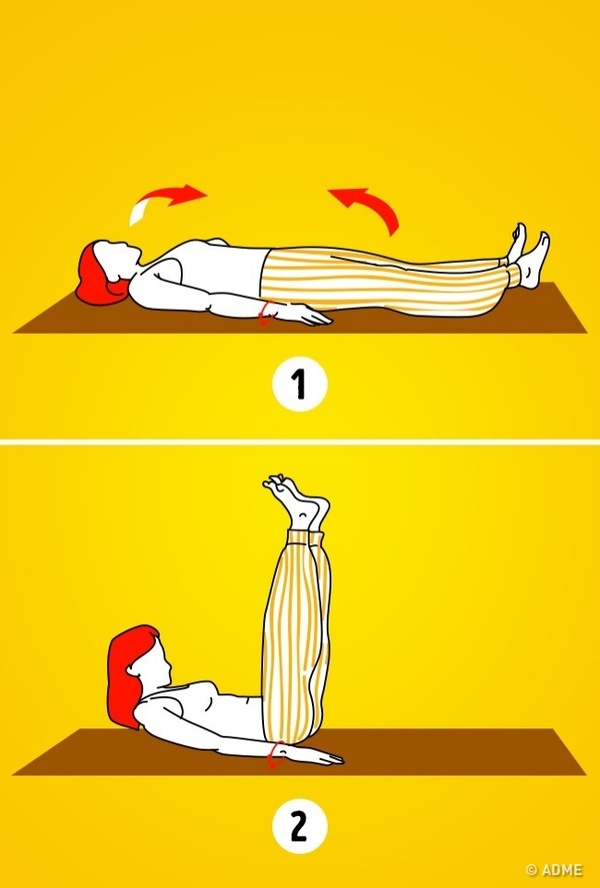 Исходное положение для второго упражнения — лежа на спине. Вытяните руки вдоль тела и дышите глубоко. Теперь поднимите голову и ноги вверх.