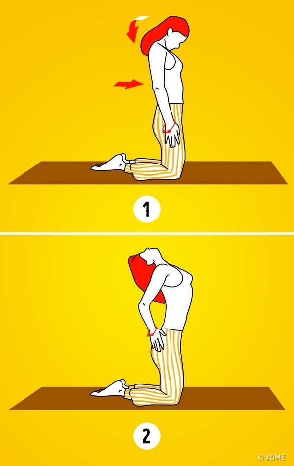 Теперь наклоните голову вперед и постарайтесь дотронуться подбородком до груди. Не забывайте про важность дыхания , дышите размеренно и глубоко. На выдохе отклоните голову назад и прогнитесь в спине.