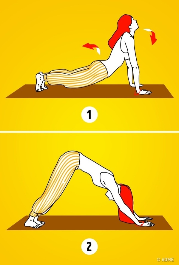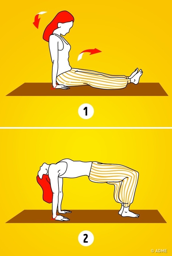 На вдохе поднимите голову и отведите ее назад , насколько это возможно , приподнимая все тело. Так вы измените положение своего тела на горизонтальное ( получится своеобразный мостик). Опора осуществляется на руки и на ноги , которые должны образовать прямые углы с туловищем.