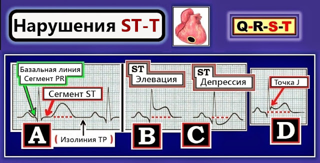 - Q, R, S (все 3 зубца характеризуют сокращение желудочков),