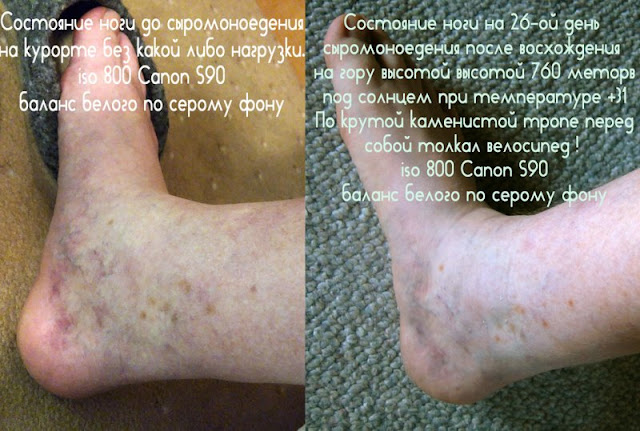 Ну и собственно итоги - с правой ногой у меня уже несколько лет проблема серьезная. После разрыва мышцы (не знал - болело и болело) пробегал неделю и получил такое мощное воспаление всей ноги, что в результате полный тромбоз двух подколенных вен и залетел в реанимацию. Два тромба по 11 и по 14 сантиметров. Врачи в один голос говори - немедленно резать. Ну да отношение к ним у нас известное, собственно на только диагноз был и нужен. Поэтому узнав что случилось перешел к атаке на тромбоз знакомыми мерами. Боль была жуткая к ноге не прикоснутся. За две недели голодовкой уриновой, и компрессами, а потом и пиявками (90 штучек за пару недель) кое как снял воспаление. Однако вены все равно сильно пострадали. И нога все время была опухшая, черная понизу и в пятнах фиолетовых. А уж если ходить с нагрузкой да еще в жаре, то распухала как колода всегда и не сгибалась до конца.