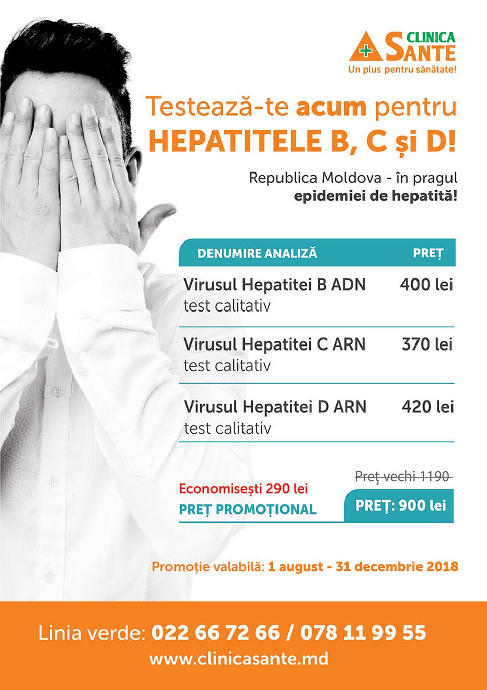 Clinica Sante заботясь о здоровье населения, сформировала единый промо-пакет, позволяющий сдать анализ на вирус гепатит B, С и D методом ПЦР всего за 900 леев (экономия 290 леев). Анализы можно сдать в одном из филиалов медицинской клинике Sante по всей республике (адреса указаны ниже).