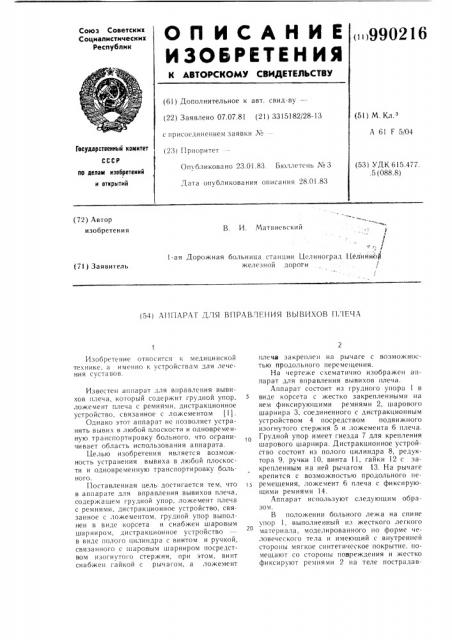 ОП ИСАНИЕ ИЗОБРЕТЕНИЯ К АВТОРСКОМУ СВИДЕТЕЛЬСТВУ Союз СоветскихСоциалистическихРеспубликень 3 убл икова но 23.01.8 пв делам изобретен и открытий ания 28.0.8 Дата опубликования оп 2) Автор изобретен и Матвиевский В Дорожная больница станции Целиноград Целиннот железной дороги 1 Заявит АВ,гГНИЯ ВЪВИХОВ П,1 ЕЧА 54) АППАРАТ плеча закреплен на рычаге с возможностью продольного перемещения.На чертеже схематично изображен аппарат для вправления вывихов плеца.Аппарат состоит из рудного упораввиде корсета с жестко закрепленными на нем фиксирующими ремнями 2, шарового шарнира 3, соединенного с дистракционным устройством 4 посредством подвижного изогнутого стержня 5 и ложемента 6 плеча.Грудной упор имеет гнезда 7 для крепления шарового шарнира. Дистракционное устройство состоит из полого цилиндра 8, редуктора 9, ручки 10, винта 11, гайки 12 с закрепленным на ней рычагом 13. На рычаге крепится с возможностью продольного перемещения, ложемент 6 плеча с фиксирую- шими ремнями 14.Аппарат используют следующим образом. медицинско ам для леч Известен аппарат для вправления вывихов плеча, который содержит грудной упор, 5 ложемент плеча с ремнями, дистракционное устройство, связанное с ложементом 11.Однако этот аппарат не позволяет устранять вывих в любой плоскости и одновременную транспортировку больного, что ограничивает область использования аппарата.Целью изобретения является возможность устранения вывиха в любой плоскости и одновременную транспортировку больного.Поставленная цель достигается тем, что в аппарате для вправления вывихов плеца, содержагцем грудной упор, ложемент плеча с ремнями, дистракционное устройство, связанное с ложементом, грудной упор выполнен в виде корсета и снабжен шаровым20 шарниром, дистракционное устройствов виде полого цилиндра с винтом и руцкой, связанного с шаровым шарниром посредством изогнутого стержня, при этом, винт снабжен гайкой с рычагом, а ложемент на спине о легкого форме чегутренней ытие, пои жестко острадавупор мате лове сторо меща фикс Изооретение относится технике, а именно к устрой тия суставов. положении больного лежа1, выполненный из жестко нала, моделированного по цеского тела и имеющий с в ны мягкое синтетическое пок ют со стороны повреждения ируют ремнями 2 на теле п