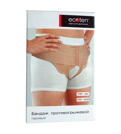 Грыжевый бандаж Экотен ГПП-443Н имеет открытую конструкцию и состоит из упруго-эластичного пояса с двусторонней фиксацией по бокам, нерастяжимой надбрюшной части и эластичных регулируемых подбедренных лямок с фиксацией спереди. Бандаж усилен пружинными ребрами жесткости, дополнительной стяжкой для посадки по фигуре и 2-мя вкладными пелотами плоской формы. Бандаж используется при односторонних и двусторонних паховых и бедренных грыжах, при реабилитации после грыжесечения, при слабости мышечно-связочного аппарата в нижней части передней брюшной стенки пахового и бедренного каналов. Использование грыжевого бандажа предупреждает выход грыжи через грыжевые ворота, препятствует ущемлению грыжи, и создает оптимальные условия для правильного формирования послеоперационного рубца и его заживления, а также предупреждения рецидива грыжи.