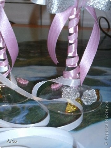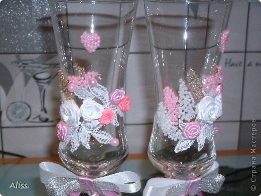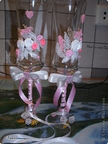 Так вот, предложила я ей бокалы, бутылочки, шпильки в прическу, бутоньерки, подвязку. Бокалы подразумевались для жениха в виде жениха, для невесты, соответственно, в виде невесты. Короче, хотелось мне сотворить набор из бокалов и бутылок в виде молодых. Невеста этот вариант сразу отмела и сказала, что хочет бокалы с розами, такой вариант отмела и я , ведь лепить я не умею, а она оказывается с ленточными розами хочет. для меня это было экзотикой, но побороздив мировую паутину, поняла, что "оно" существует! Принялась учится розы крутить. Ах забыла рассказать о главной сложности-----300 км расстояние между нами! Общались по интернету. Вечерами качала фото с примерами, а утречком делала, пока детвора моя сладко сопела и сны глядела. Вот, что родилось в итоге. На фото очень непонятно получилось,в жизни они в сто раз красивее .