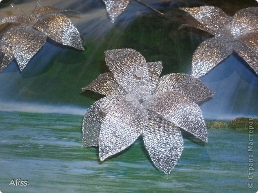 Спасибо за похвалу. Секретом поделюсь с удовольствием! Вырезала шаблон лепестка из картона, по шаблону 8 лепестков из металлизированной ленты (из простой пробовала, совсем не смотрится((((() брала проволоку для бисероплетения(не очень толстую) и каждый лепесток продевала вдоль посередине(маленькими стежочками)-чтоб проволока смотрелась как прожилка на лепестке. А потом сборка: берете тычинки, какие захотите (я приклеивала крупный бисер на толстую леску, очень редко, по 2-4 штуки на 1 тычинку) и вокруг тычинки, ниткой в тон, приматываете 3 лепестка, во втором ряду -5 лепестков. И все. Так просто. самым сложным было опалить лепестки, они то горели, то недостаточно оплавлялись(потом волокна высыпались). По размеру лепестки в самой широкой части были 2,5 см, по длине около 5.Если что не понятно- спрашивайте, не стесняйтесь!