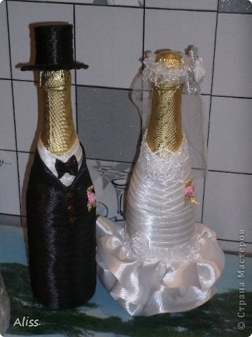 Лихорадка, потому что, как узнала, что племянница выходит замуж, залихорадило меня, захотелось понаделать всяких свадебных вещиц.Кстати,бутылки эти никакого отношения к данной свадьбе не имеют, т. к. невеста от них отказалась.