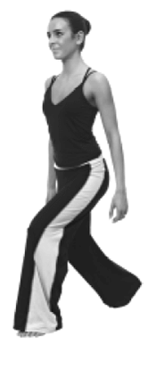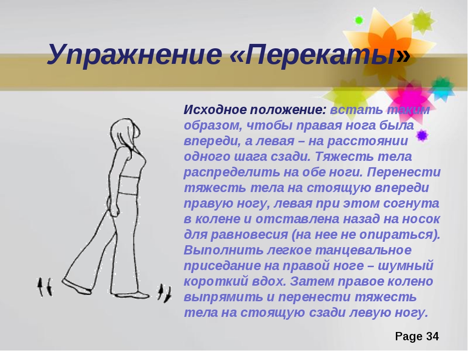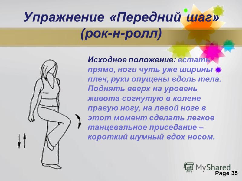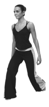- Веселый танец. Упражнение делается из положения стоя, руки и плечевой пояс расслаблены, ноги сведены вместе. На вдохе сделайте шаг вперед с левой ноги, перенеся на нее вес тела. Левую ногу немного согните, правую перенесите на носок, согнутые руки в локтях отводятся влево и вперед. На выдохе вернитесь в исходное положение. Без паузы на следующем вдохе сделайте шаг уже другой ногой, повторив те же движения рук в противоположную сторону. Выдохнув, снова верните исходное положение.