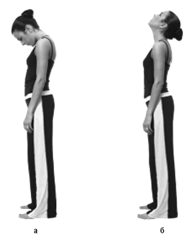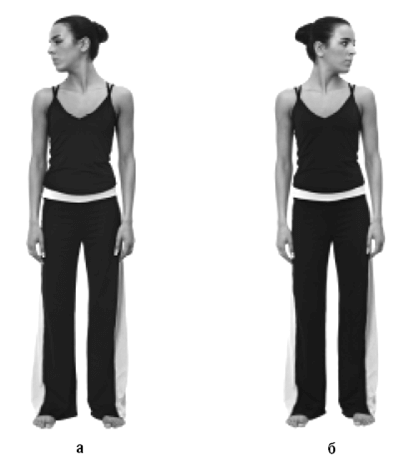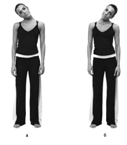 Займите исходную позицию, ноги расставьте немного уже ширины плеч. Начинаем покачивания головой. Сначала слегка наклоните голову вправо (рис. 2а), правое ухо направлено к правому плечу – одновременно шумный короткий вдох носом. Затем наклоните голову влево (рис. 2б), левое ухо направлено к левому плечу – одновременно сделайте вдох.