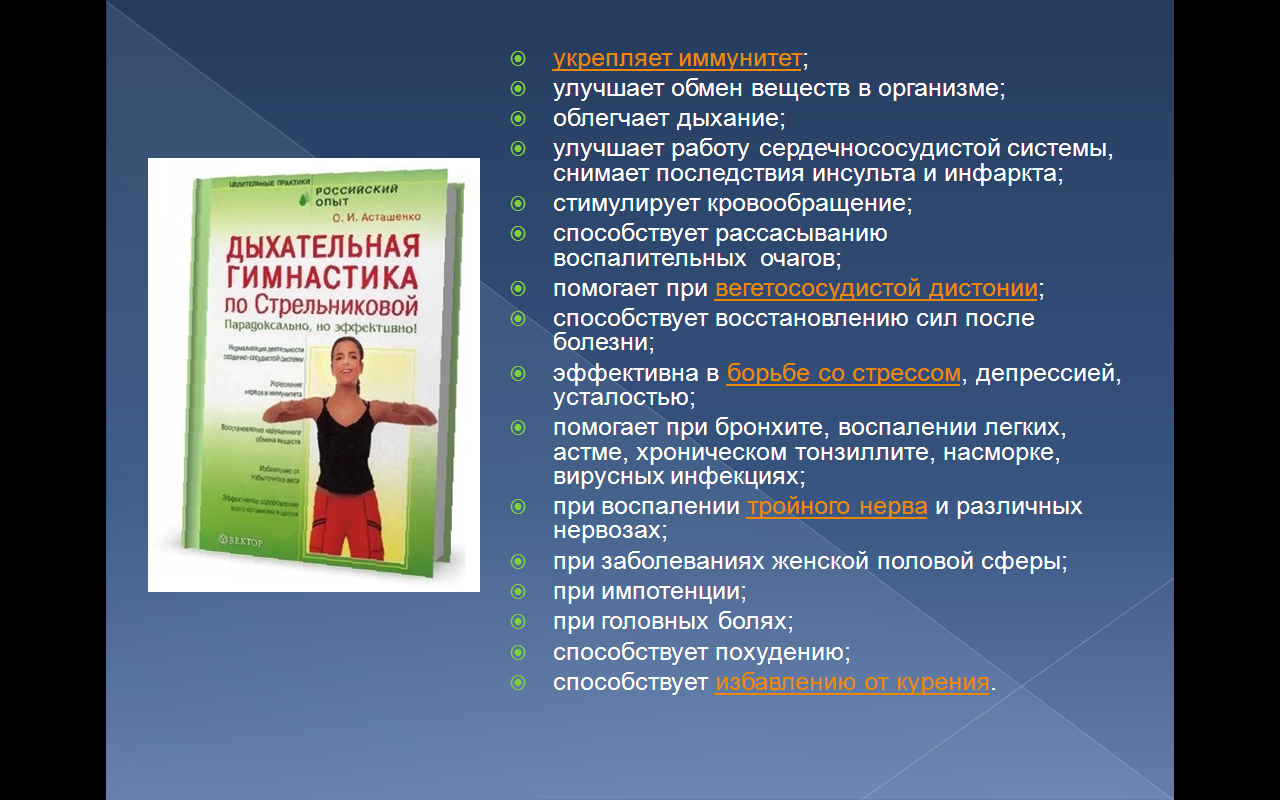 Svetlanka. Занимаюсь дыхательной гимнастикой по Стрельниковой с 2000 года. Муторно, долго. Бросала, но возвращалась опять, потому что ощущаю эффект. Меньше болею простудой, сил больше и, что для меня важно, резко худею. Советую попробовать!
