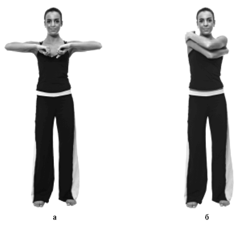 Обратите внимание, чтобы руки шли параллельно друг другу, а не крест-накрест (то есть плечо – подмышка, а не плечо – плечо). Ни в коем случае не меняйте расположение рук (все равно, какая рука сверху – правая или левая); широко в стороны не разводите и не напрягайте. Локти тоже нельзя разгибать. Выполняйте упражнение в темпе шагов.