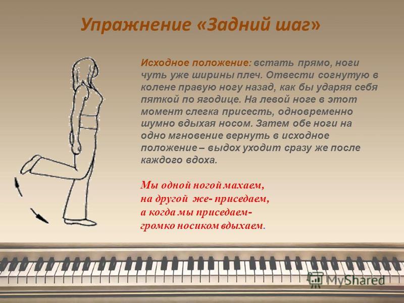 Исходное положение то же, что и в предыдущем упражнении. Только теперь вам нужно отводить согнутую ногу не вперед, а назад. Выполняйте приседание на правой ноге, отводите назад левую ногу, согнутую в колене, и старайтесь шлепнуть себя пяткой по ягодицам. Одновременно делайте шумный резкий вдох носом.