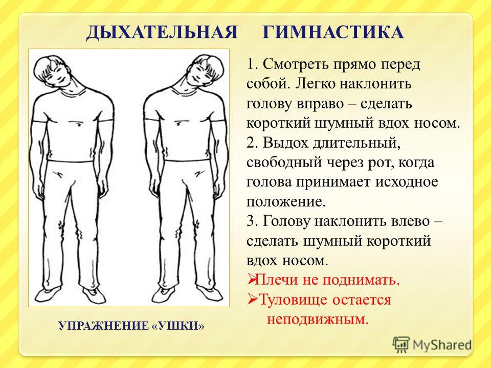 - Наклоны головы. Исходное положение как в предыдущем упражнении. Делая резкий и короткий вдох, наклоните голову, прижимая ухо к своему левому плечу, сделайте плавный выдох и вернитесь в исходное положение. Без паузы вдохните снова, наклоните голову уже вправо. Сделайте 12 подходов по 8 вдохов и выдохов в каждом.