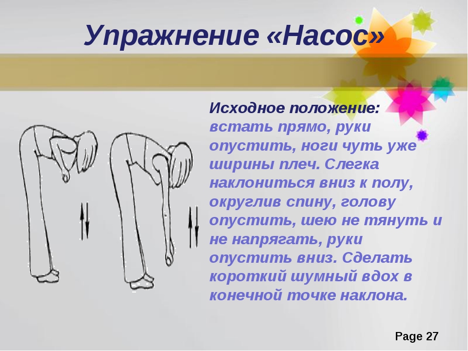 - Накачка мяса. Исходное положение как в первом упражнении. При активном резком вдохе корпус наклоняется вперед, голова опускается, плечи округляются, а руки вытягиваются вперед и расслабляются, свешиваясь вниз. Всего надо сделать 12 подходов по 8 наклонов и вдохов в каждом. Для детей игровая форма упражнения проводится с мячиком, который после каждого вдоха надо надувать. Так малыш легче усвоит правильную технику выполнения, и упражнения будут для него приятнее.
