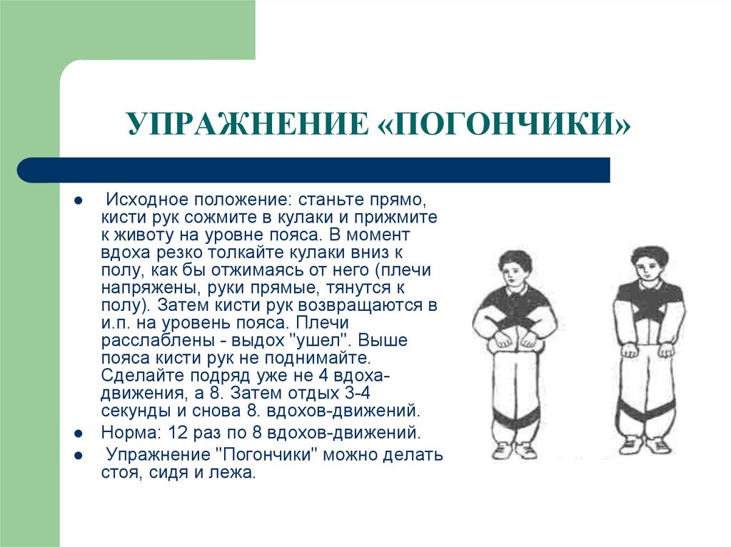 - Сбрасывание груза. Упражнение делается с исходного положения стоя с расставленными на ширине плеч ногами, руки находятся на поясе, кисти сжаты в кулак. При коротком и шумном вдохе напрягается плечевая мускулатура, затем руки опускаются, одновременно разжимаются кулаки и вытягиваются пальцы, будто вы избавились от тяжелой ноши. Выдыхая, немного разжимайте губы, примите исходное положение. Нужно сделать 12 подходов, в каждом из которых по 8 вдохов и выдохов.