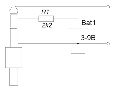В большинстве случаев допустимо использовать одну/две батарейки 1,5 В (в зависимости от используемого микрофона) для питания микрофона. Батарейка включается последовательно с микрофоном (Рис.05).
