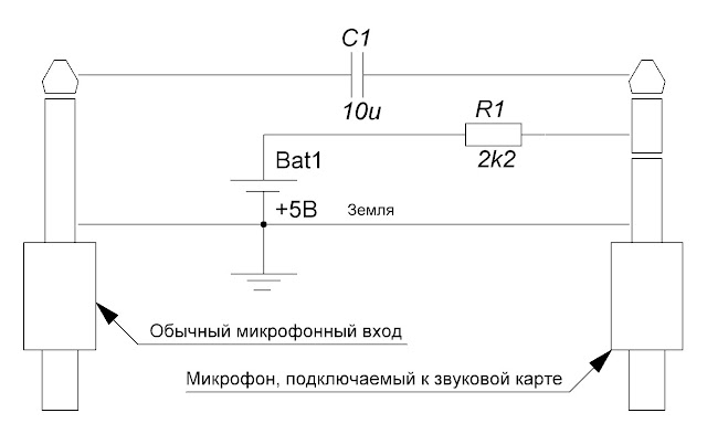 Эта схема (Рис.10) подходит для подключения трех- проводного капсюля электретного микрофона к звуковой карте Sound Blaster, которая поддерживает подачу напряжения смещения (НС) к электретному микрофону.