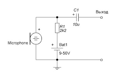 | Рис.05 - Простейшая схема питания электретного микрофона |