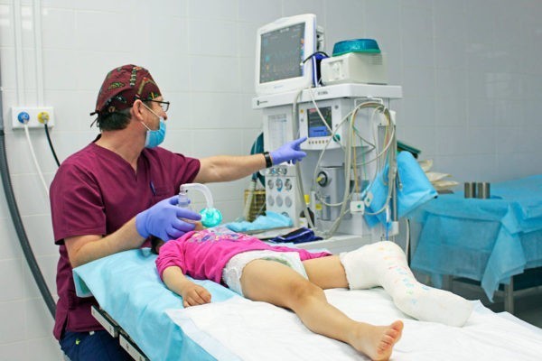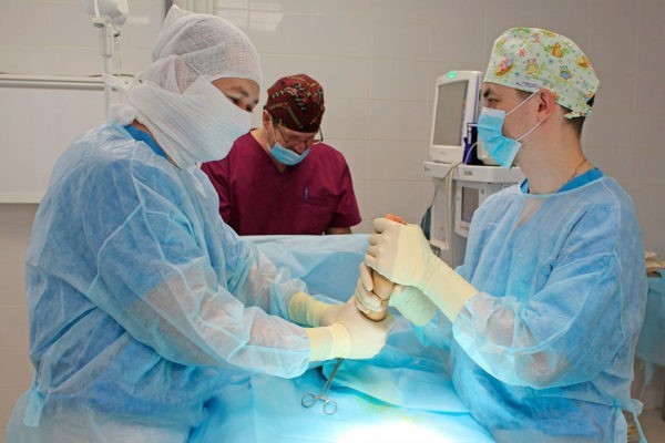 Пока мы переодевались, маленькая Сорока уже уснула на операционном столе. Там мы видим даже не спящую девочку, а ее ногу: остальное скрыто одноразовыми зелеными пеленками. На бедре у девочки жгут, чтобы кровь не текла. Вавилов обтирает ногу большим тампоном, вымоченным в йоде. Нога желтеет. Врач обматывает ногу от пальцев до колена эластичным бинтом и минутку держит вертикально, чтобы окончательно обескровить. Размотав, кладет на стол. Желтоватая нога теперь похожа на силиконовый тренажер.