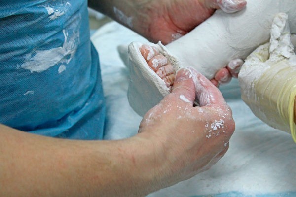 Сначала врач разминает стопу путем ручных манипуляций. Но силовые приемы противопоказаны: нужны мягкие манипуляции, без силовых приемов. Как только стопа чуть-чуть корректируется, ее положение понемножку исправляется, на ногу применяется гипсовый сапожок. Он накладывается на ногу чуть выше стопы и выше колена. Когда проходит определенное время, врачи снимают сапожок и снова начинают работать со стопой, исправляя ее положение дальше. Затем – снова гипсовый сапожок, и так еще несколько этапов.