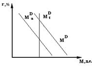 Часто первый и второй мотивы объединяют в один, как трансакционный, поскольку эти два мотива спроса на деньги не зависят от уровня ставки процента. Графически трансакционный спрос (M D t) выглядит как вертикальная линия, расстояние которой от оси ординат определяется величиной НД (рис.18).