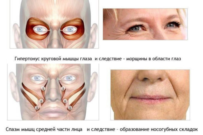 Гипертонус мышц — причина образования морщин и складок. Лицо — сложнейшая биомеханическая конструкция: на таком маленьком участке как лицо и шея сосредоточено около 100 мышц, 29 костей черепа — и все это в постоянном движении.