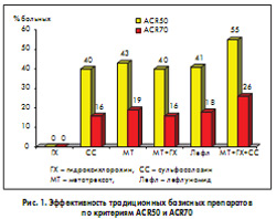 В конце XX века в лечении РА был достигнут существенный прогресс главным образом благодаря трем факторам: появлению нового высокоэффективного базисного препарата – лефлуномида, который вместе с метотрексатом (МТ) стал золотым стандартом фармакотерапии РА; внедрению стратегии раннего агрессивного лечения, предусматривающей назначение в первые месяцы заболевания эффективных базисных средств в сочетании с низкими дозами глюкокортикоидов (ГК) и жесткий контроль результата терапии с быстрой заменой, при необходимости – базисных препаратов; применению комбинированной базисной терапии. Тем не менее в целом результаты лечения РА до недавнего времени не внушали оптимизма. Так, монотерапия ни одним из базисных препаратов не позволяла добиться регресса симптоматики РА на 50% (критерий ACR50) хотя бы у половины больных (рис. 1). Даже при применении современных схем лечения индекс активности болезни (DAS28) оставался на уровне 4,2, что соответствует среднему уровню активности РА (усредненные данные по 20 странам – исследование QUEST). По самым оптимистичным оценкам, ремиссии через 2 года удавалось добиться не более чем у трети больных, а через 5 лет она сохранялась лишь у 12-17% пациентов. Таким образом, у значительной части больных не удавалось добиться приемлемого результата, что требовало разработки новых фармакотерапевтических подходов.