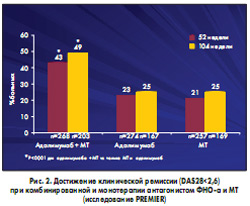 Первыми в ревматологической практике стали использоваться ингибиторы ФНО-a, в частности – инфликсимаб, и, соответственно, накоплен наибольший опыт их применения. По данным на 2008 г., лечение инфликсимабом во всем мире получали более 1 млн больных, этанерцептом – около 500 тыс., адалимумабом – около 200 тыс. Инфликсимаб с высокой специфичностью блокирует как циркулирующий, так и фиксированный на клеточных мембранах ФНО-a. Образуя стабильные комплексы с ФНО-a, препарат не только эффективно подавляет биологическую активность этого цитокина, но и комплементзависимым путем или за счет антитело-зависимой клеточно-опосредованной цитотоксичности индуцирует лизис клеток, продуцирующих ФНО-a. В результате применения инфликсимаба происходит подавление продукции цитокинов и хемокинов в суставах (ФНО-a, ИЛ-1, ИЛ-6 и др.), снижение в сыворотке уровня ИЛ-1, ИЛ-6, фактора роста эндотелия сосудов, хемокинов, белков острой фазы и РФ, снижение количества нейтрофилов в суставах, восстанавливается Т-клеточный иммунный ответ, ингибируется ангиогенез и предотвращается разрушение кости и хряща. В многочисленных клинических исследованиях продемонстрирована способность инфликсимаба и других анти-ФНО-a агентов оказывать выраженный положительный клинический эффект и замедлять рентгенологическое прогрессирование РА. Согласно существующим рекомендациям по применению этой группы препаратов 2006 и 2008 гг. антагонисты ФНО-a рекомендуется использовать для лечения РА, сохраняющего активность, несмотря на адекватные попытки терапии другими базисными препаратами, чаще всего – МТ. Антагонисты ФНО-a с успехом могут применяться совместно с другими базисными препаратами, включая сульфасалазин, лефлуномид и др. Эти препараты эффективны также у больных, не получавших ранее МТ, однако комбинация антагонистов ФНО-a и МТ позволяет получить лучшие клинические и рентгенологические результаты. Достаточно убедительно это было продемонстрировано в исследовании PREMIER, согласно результатам которого при монотерапии адалимумабом и МТ клиническая ремиссия достигалась с одинаковой частотой, в то время как при совместном применении этих препаратов ремиссию наблюдали в 2 раза чаще (рис. 2).