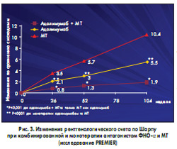 Еще более впечатляющими были различия относительно динамики рентгенологических изменений: после 2-летней терапии прирост рентгенологического счета по Шарпу при совместном применении адалимумаба и МТ был почти в 3 раза меньшим по сравнению с лечением только адалимумабом и в 5,5 раза меньшим в сравнении с монотерапией МТ. При этом различия между группами становились достоверными очень рано – уже через 6 мес (рис. 3).