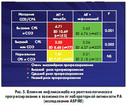 Проведенный позднее дополнительный анализ среди больных, вошедших в исследование ATTRACT и имевших ранний РА, показал особо значительные преимущества комбинированной терапии инфликсимабом и МТ по сравнению с лечением только МТ. Это было первое доказательство, обосновывающее раннее назначение ингибиторов ФНО-a с целью как можно более раннего предотвращения деструкции суставов и сохранения функции. В дальнейшем этот тезис был неоднократно подтвержден и развит, в том числе в исследованиях ASPIRE и BeSt. Кроме высокой эффективности инфликсимаба как при раннем, так и при позднем РА в исследовании ASPIRE было также показано, что влияние препарата на замедление рентгенологического прогрессирования РА тем больше, чем выше исходная лабораторная активность (рис. 5).