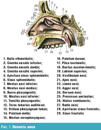 Полость носа (cavum nasii) (рис. 1) располагается между ротовой полостью и передней черепной ямкой, парными верхнечелюстными и парными решетчатыми костями. Носовая перегородка разделяет ее сагиттально на две половины, открывающиеся кпереди ноздрями и кзади, в носоглотку, хоанами. Обе половины полости носа окружены околоносовыми пазухами: верхнечелюстной, решетчатым лабиринтом, лобной и клиновидной, каждая из которых сообщается соустьем с полостью носа. Носовая полость имеет четыре стенки: нижнюю, верхнюю, медиальную и латеральную.