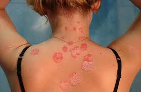 Еще одно заболевание, которое сопровождается появлением сухих круглых пятнышек на теле, – псориаз. Новообразования имеют розовый цвет, гладкую и блестящую поверхность. Спустя 2 -3 дня на месте пятен возникают серебристо-белые чешуйки. Высыпания склонны к слиянию, образуя крупные конгломераты.