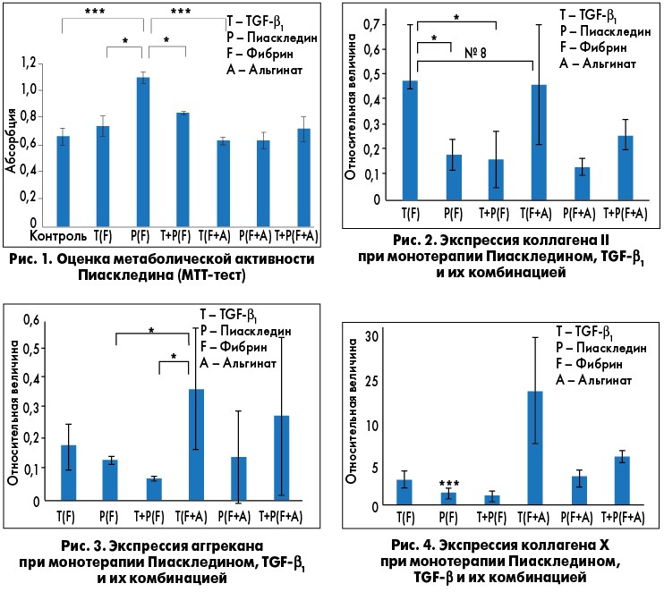 Установлено, что Пиаскледин более выражено увеличивает выживаемость и пролиферацию дифференцированных клеток в каркасе фибрина по сравнению с TGF-β и комбинацией Пиаскледин + TGF-β. Комбинация Пиаскледина и TGF-β значительнее увеличивала пролиферацию стволовых клеток в фибриновом каркасе, чем только TGF-β или только Пиаскледин в фибрин-альгинатном каркасе (рис. 1). Кроме того, при лечении Пиаскледином, в том числе в комбинации с TGF-β, отмечался достоверно более низкий уровень в хрящевой ткани коллагена Х, ответственного за побочное действие TGF-β (оссификация хряща и других мягких тканей) по сравнению с монотерапией TGF-β. Авторы исследования также отмечают, что и Пиаскледин, и TGF-β значительно повышали уровень аггрекана – протеогликана, участвующего в сохранении гидратированности хрящевой ткани. Протеогликаны, в частности аггрекан, являются основными компонентами матрикса суставного хряща, поэтому данные о возможности влияния на их концентрацию в хрящевой ткани немаловажны. По результатам полимеразно-цепной реакции установлены значительные различия в экспрессии коллагена ІІ, X и аггрекана между группами (рис. 2-4), и на основании этих данных можно сделать вывод, что Пиаскледин по ряду биостимулирующих эффектов не уступает TGF-β1, а по некоторым – превосходит его.