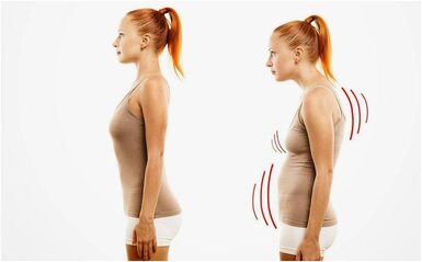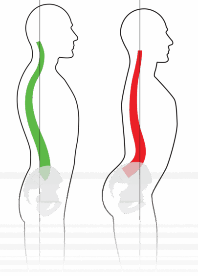 - Изменение осанки – голова, плечи и живот несколько выдвинуты вперед, грудная клетка плоская, таз и тело немного наклонены назад, причем, если изгиб усилен в одном отделе, в других отделах искривление также более выражено;