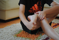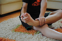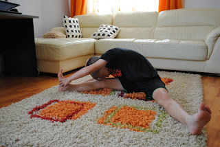 Растяжка мышц сгибающих ногу в колене - встаем на согнутые в коленях ноги, затем одну ногу вытягиваем перед собой. Сохраняя вытянутую ногу прямой наклоняемся и рукой тянем к себе ее носок. Затем меняем ноги.