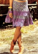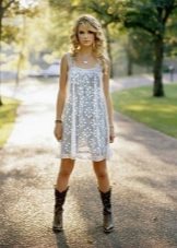 • Юбки и платья. Романтичные короткие туники, джинсовые мини, юбки-солнце, стильные свободные юбки до колена, летние сарафаны, простые длинные платья - всё это сочетается с ковбойскими сапогами. Образы смотрятся невероятно привлекательно. Ваш наряд получится женственным и оригинальным, комфортным и актуальным.