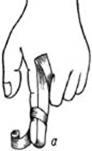 Повязка на большой палец (рис. 4) делается по типу колосовидной. Она также начинается и закрепляется на запястье. Если надо забинтовать кисть и четыре пальца, берут широкий бинт и ведут его по тыльной поверхности от запястья к периферии, перегибают через концы пальцев и, повернувшись по ладонной поверхности на предплечье, закрепляют здесь бинт циркулярным ходом. Повторив эти два типовых хода 2—3 раза, закрепляют всю повязку восьмиобразными ходами, идущими от лучезапястного сустава через кисть на пальцы (рис. 5, а).