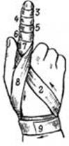 Спиральная повязка на палец (рис.18). Большинство повязок на кисть начинается с круговых закрепляющих ходов бинта в нижней трети предплечья непосредственно над запястьем. Бинт ведут косо по тылу кисти к концу пальца и, оставляя кончик пальца открытым, спиральными ходами бинтуют палец до основания. Затем снова через тыл кисти возвращают бинт на предплечье. Бинтование заканчивают круговыми турами в нижней трети предплечья.