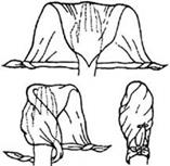 Пращевидную повязку удобно накладывать на нос, губы, подбородок, а также на все лицо. Ее ширина должна быть достаточной, чтобы закрыть всю поврежденную поверхность, а длина – около полутора окружностей головы. Подготовленную повязку разрезают вдоль с двух сторон, оставив середину целой. например, по размеру подбородка.