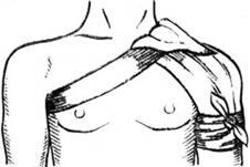 Плечо имеет форму цилиндра, а поэтому обычно циркулярная или спиральная бинтовая повязка легко смещается книзу. Во избежание этого кожу плеча смазывают клеолом или проводят несколько туров через надплечье и грудь аналогично колосовидной повязке на область плечевого сустава (см. ниже).
