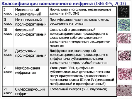 При сопоставлении этих двух классификаций (см. таблицу 3) можно отметить параллели между мезангиопролиферативным гломерулонефритом и II классом и, отчасти, между очаговым пролиферативным волчаночным нефритом и III классом. Класс IV включает в себя диффузный пролиферативный волчаночный нефрит, а также случаи мезангиокапиллярного гломерулонефрита. Класс V соответствует мембранозному нефриту, а VI — фибропластическому.