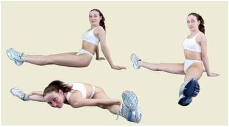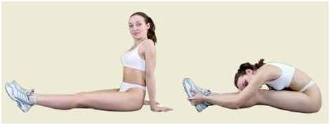Сядьте на пол, выпрямите ноги и разведите их в стороны. Согните правую ногу, а руками постарайтесь дотянуться до носка левой, не сгибая её. Задержитесь в таком положении на 1 минуту, вернитесь в исходное положение. Выполните тоже самое и для левой ноги.