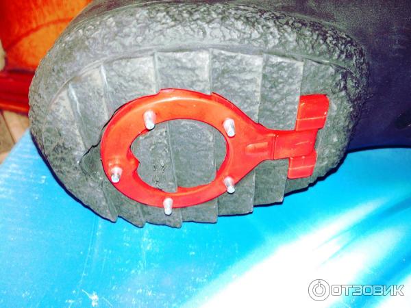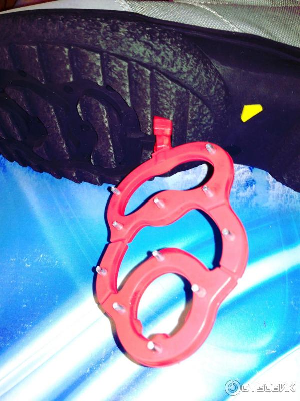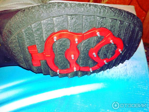 Чтобы сменить положение системы антигололед, надо лишь подцепить край этого антигололедного устройства и повернув подвижную скобку, вставить эту красную штучку в прорези на подошве. Поверьте мне, это делается очень быстро и легко.