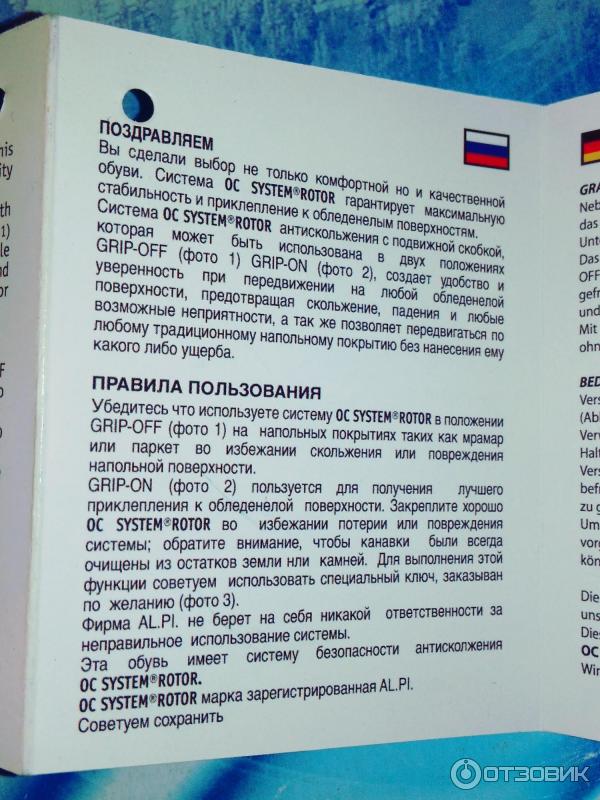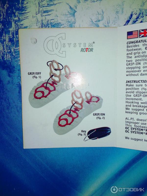 Так же здесь все нарисовано на картинках. Когда я увидела в этой инструкции рисунок специального ключа для переворачивания системы антигололед, я решила, что мой спецключ мне не доложили, даже хотела вернуться в магазин, но вчитавшись внимательнее в инструкцию прочла, что в моей модели зимних сапог ключ надо дополнительно заказывать. Но я не стала заказывать ключ. Мне достаточно подцепить край этой антигололедной системы железной пилочкой для ногтей. Это сделать нетрудно. Потом я поворачиваю систему вокруг своей оси и вставляю ее в углубления на подошве. Все система антигололед OC System*Rotor в том или ином положении готова для ходьбы по скользким тротуарам, по льду, или же наоборот по паркету или плиточному полу.