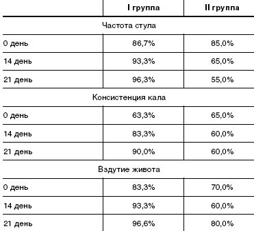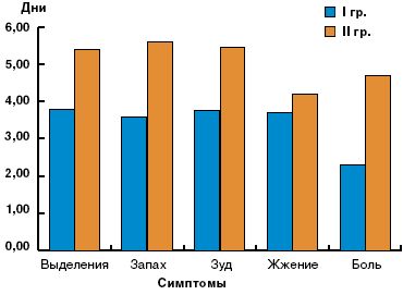 В обеих группах наблюдалось клиническое улучшение, проявляющееся в исчезновении признаков бактериального вагиноза. Однако сроки выздоровления достоверно отличались: наиболее быстро клинический эффект достигался в группе I (комбинированная терапия — Лактофильтрум ® + метронидазол), сроки исчезновения симптомов бактериального вагиноза у пациентов группы II со стандартной терапией метронидазолом были больше. Группы наблюдения изначально отличались друг от друга по показателям нарушения консистенции стула, частоты стула и вздутия живота. Но при этом в группе I (Лактофильтрум ® + метронидазол) на фоне лечения прослеживается четкая тенденция к увеличению количества больных с нормальной желудочно-кишечной симптоматикой, в группе II (метронидазол) на фоне лечения количество пациентов с нормальными показателями этих симптомов уменьшилось.