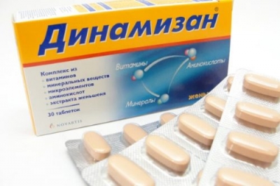 - Динамизан. Общеукрепляющее средство для организма. В состав входят: витамин А, В1, В2, В3, В5, В6, В8, В12, С, D3, Е, глутамин, аргинин, кальций, магний, фосфор, селен, йод, цинк и экстракт женьшеня. Таблетки для бодрости и активности рекомендуют принимать при неполноценном питании (диеты), сниженном половом влечении, зависимости от курения, постоперационном периоде, поддержании истощённого организма от умственных и физических нагрузок. Принимать средство нужно с утра по 1 шт. 1 раз в день. Цена — 500 р.