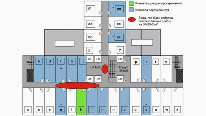 План девятого этажа отеля Metropole в Гонконге, показывающий, где произошло суперраспространение вируса SARS | Источник: CfDCaP, Atlanta, Georgia, USA (C.R. Braden, S.F. Dowell, D.B. Jernigan); Emory University, Atlanta (J.M. Hughes)