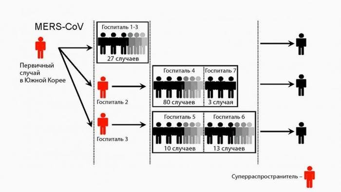 Часто суперраспространение происходит в больницах. Так было при пандемии SARS 2003−2004 годов и в 2015-м во время вспышки ближневосточного респираторного синдрома MERS в Южной Корее, когда один инфицированный вирусом MERS-CoV заразил 82 человека — пациентов, посетителей и медперсонал. Причем это был не единичный случай. В другой больнице один пациент заразил 44 человека, а всего зафиксировано пять массовых заражений вирусом MERS-CoV в медицинских учреждениях. В такой ситуации самый главный фактор риска — близость к суперраспространителю.