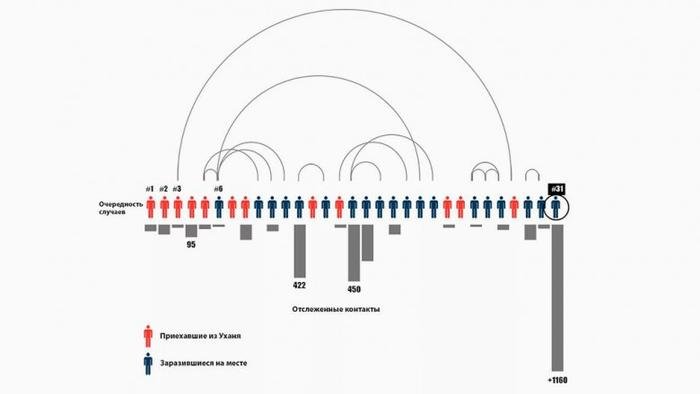 Неизвестно, где она заразилась, но всего за три дня, посетив две больницы, два собрания в церкви, на каждом из которых присутствовали более 500 человек, а также фуршет в отеле, она инфицировала сотни. Из 4400 обследованных прихожан церкви Синчхончжи диагноз подтвердили у 544-х, 9000 поместили на карантин. Как пишет Reuters со ссылкой на Корейский центр по профилактике и контролю заболеваний, от пациента 31 пострадали несколько тысяч человек.