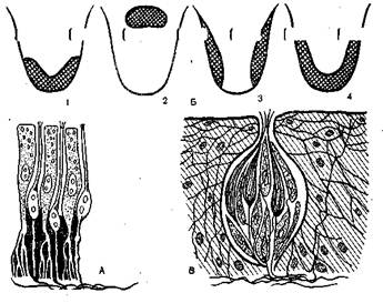 Рис. 19. Обонятельный (А) и вкусовой (В, В) рецепторы: А — рецепторные обонятельные клетки с обонятельными нервами; В — зоны расположения вкусовых рецепторов на языке, воспринимающих различные вкусовые раздражения (/—сладкую, 2—горькую, 3 — кислую, 4 — соленую пищу); В — вкусовая луковичка в разрезе